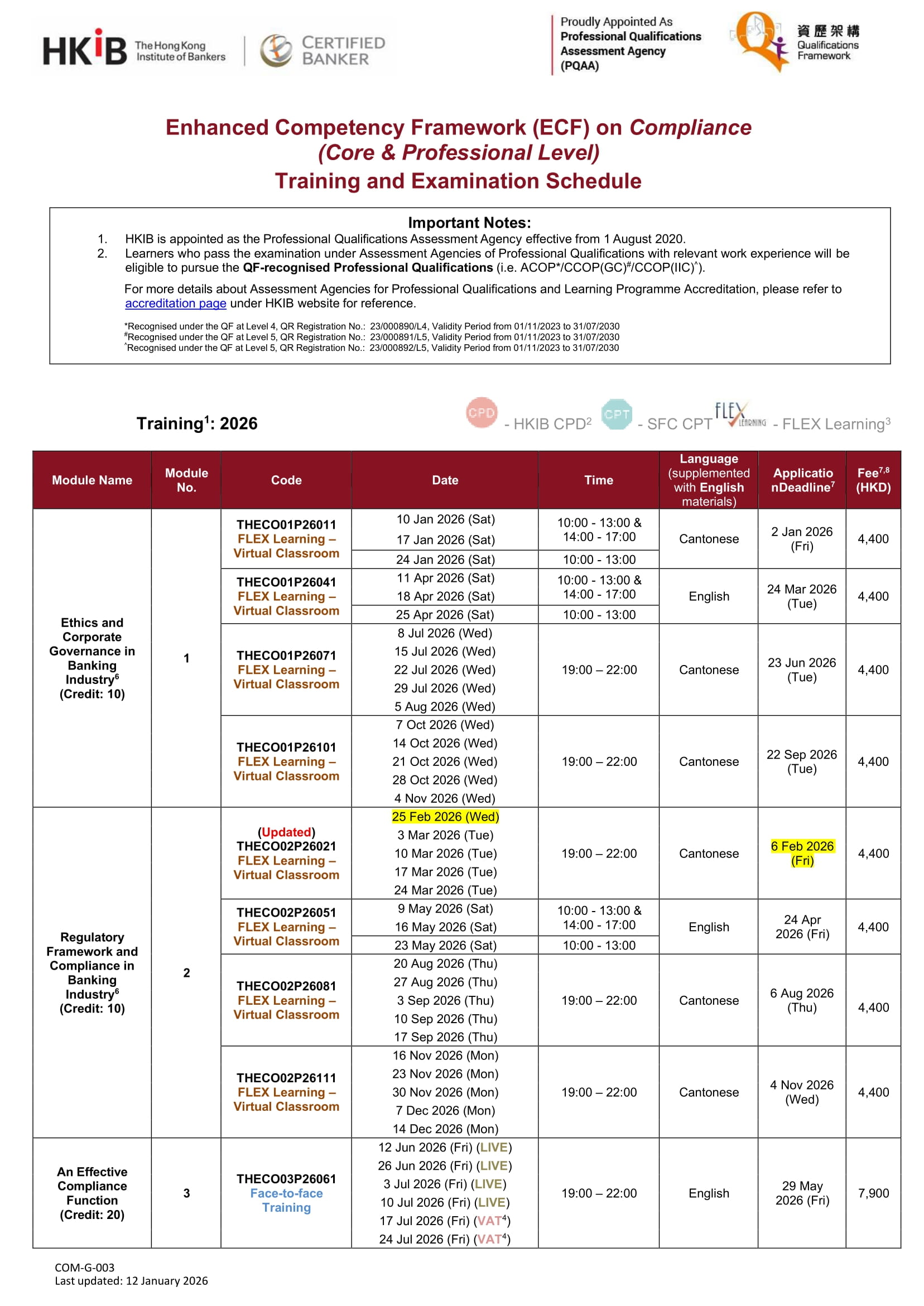 The ECF-Compliance certifications are subject to annual renewal by HKIB. PQ holders are required to comply with the annual Continuing Professional Development (CPD) requirements and pay an annual certification renewal fee to renew the certification. For Core Level qualification, the requirement is a minimum of 10 verifiable CPD hours for each calendar year, of which at least 5 CPD hours should be earned from activities related to topics of compliance, legal and regulatory requirements, risk management and ethics. For Professional Level qualifications, the requirement is a minimum of 12 verifiable CPD hours for each calendar year, of which at least 6 hours should be earned from activities related to topics of compliance, legal and regulatory requirements, risk management and ethics.