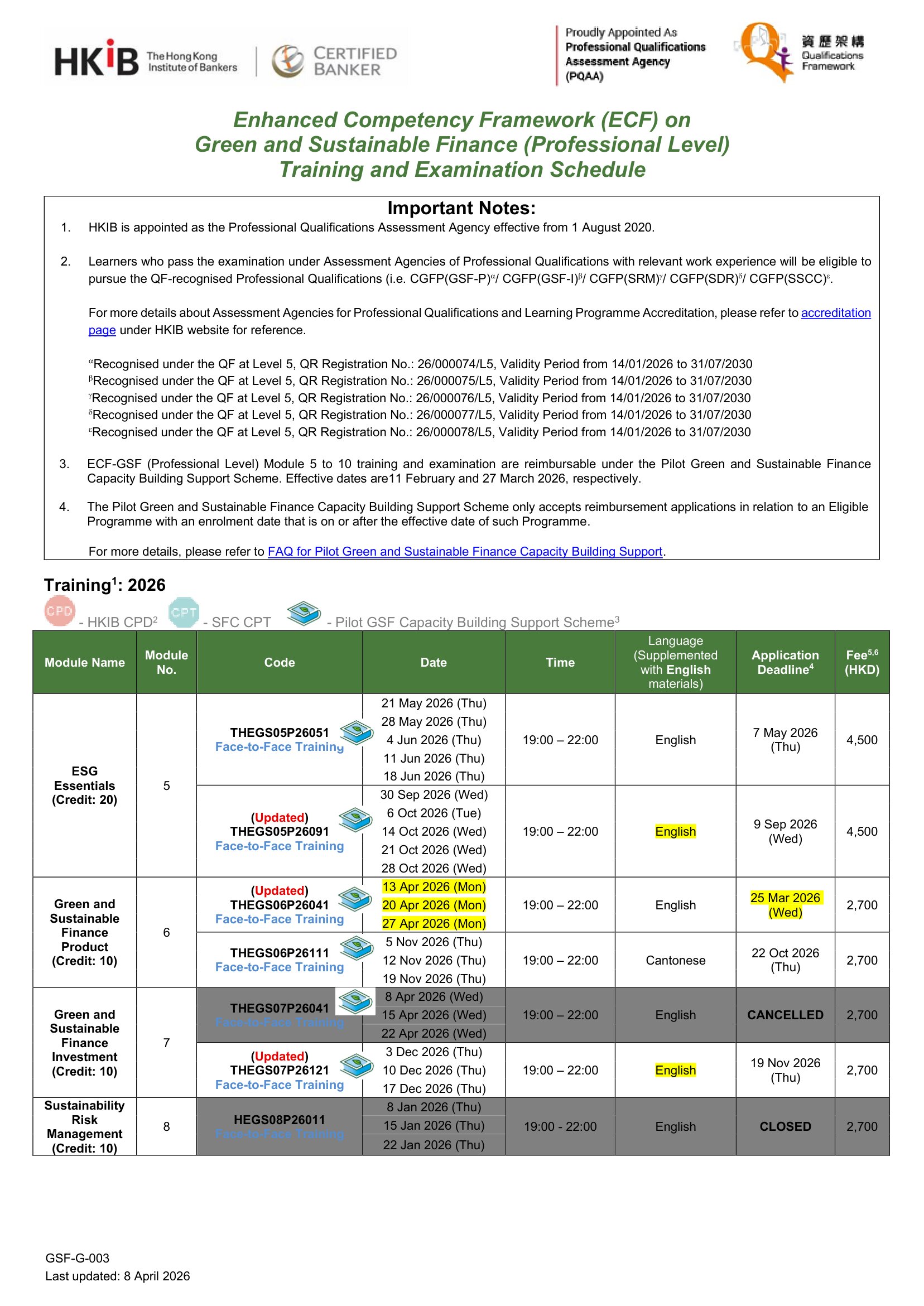 Eligible candidates can apply for the subsidy should they obtained "Certificate of Achievement" or "Certificate of Completion" of each module under ECF-GSF Professional Level. Below is a summary table for your reference: