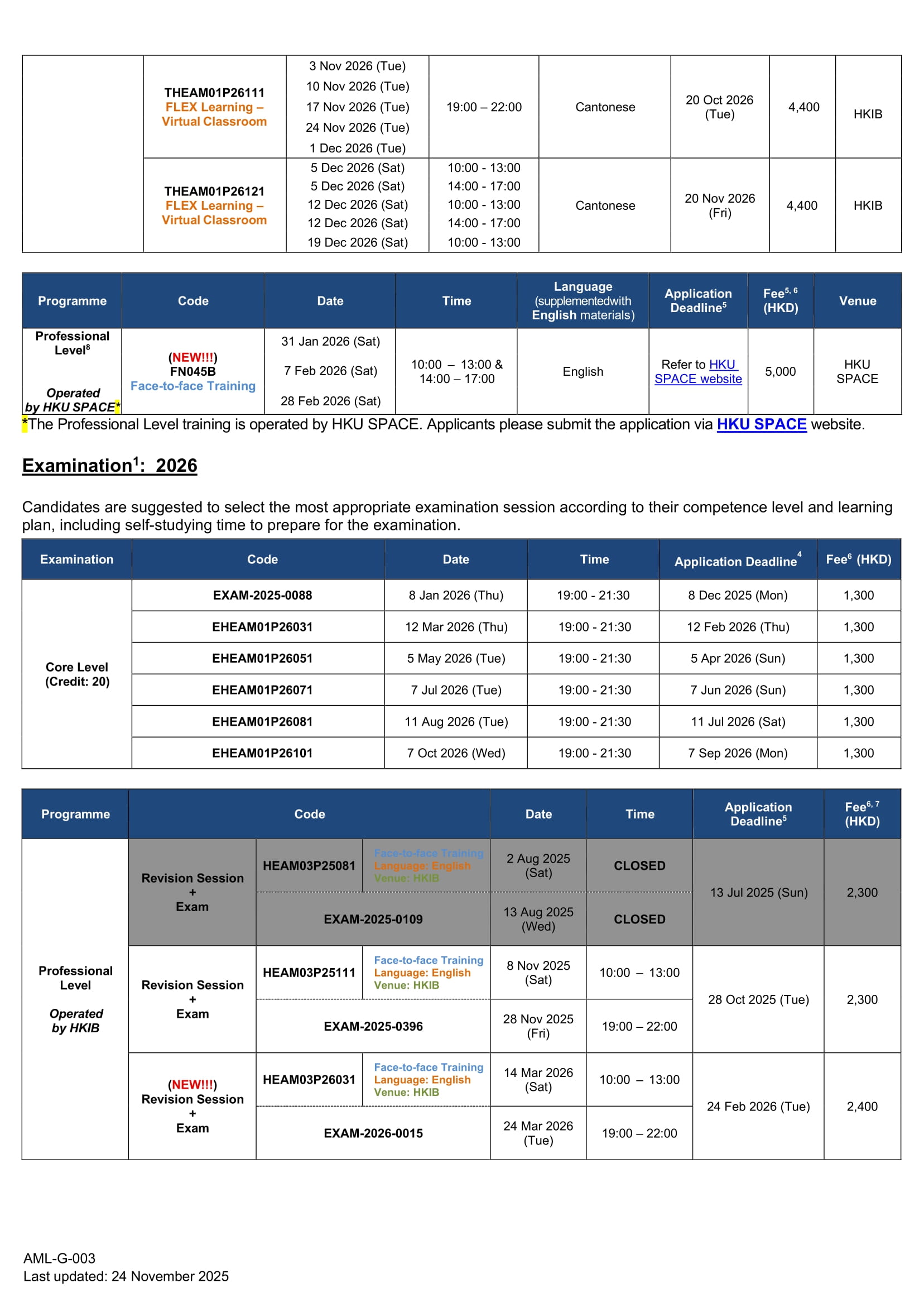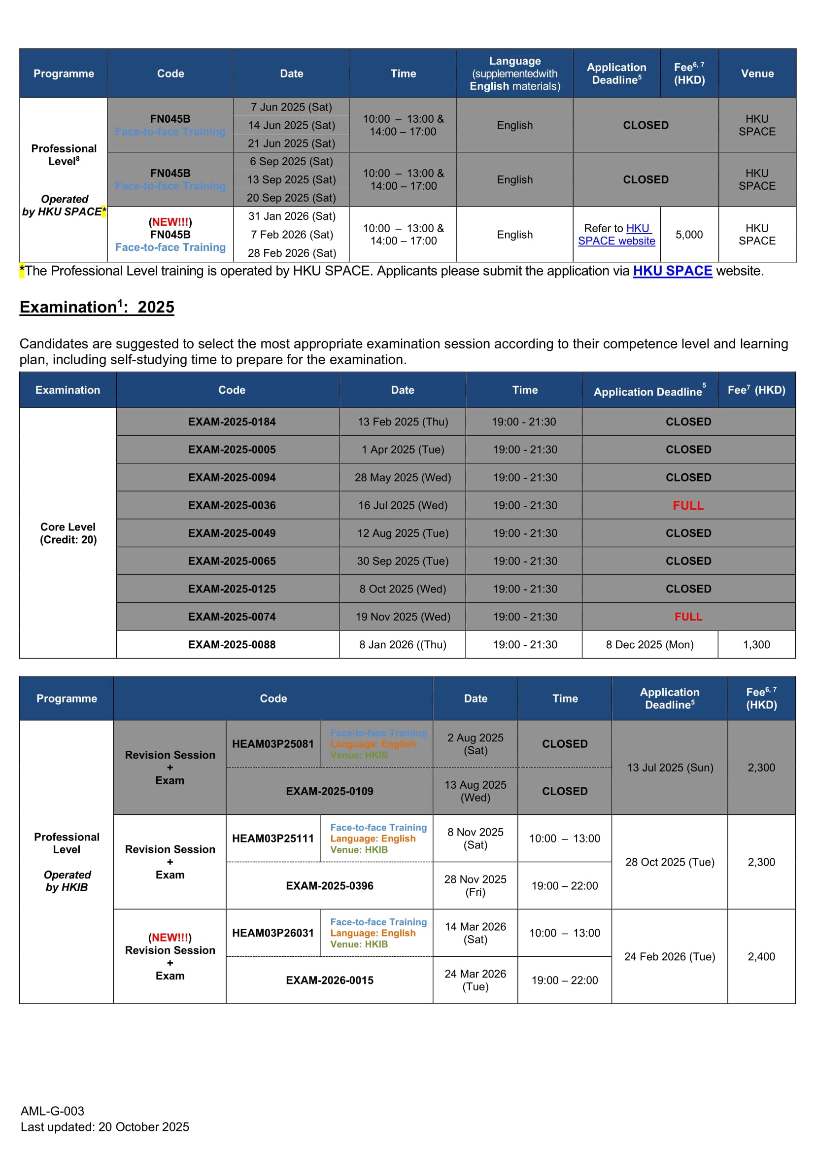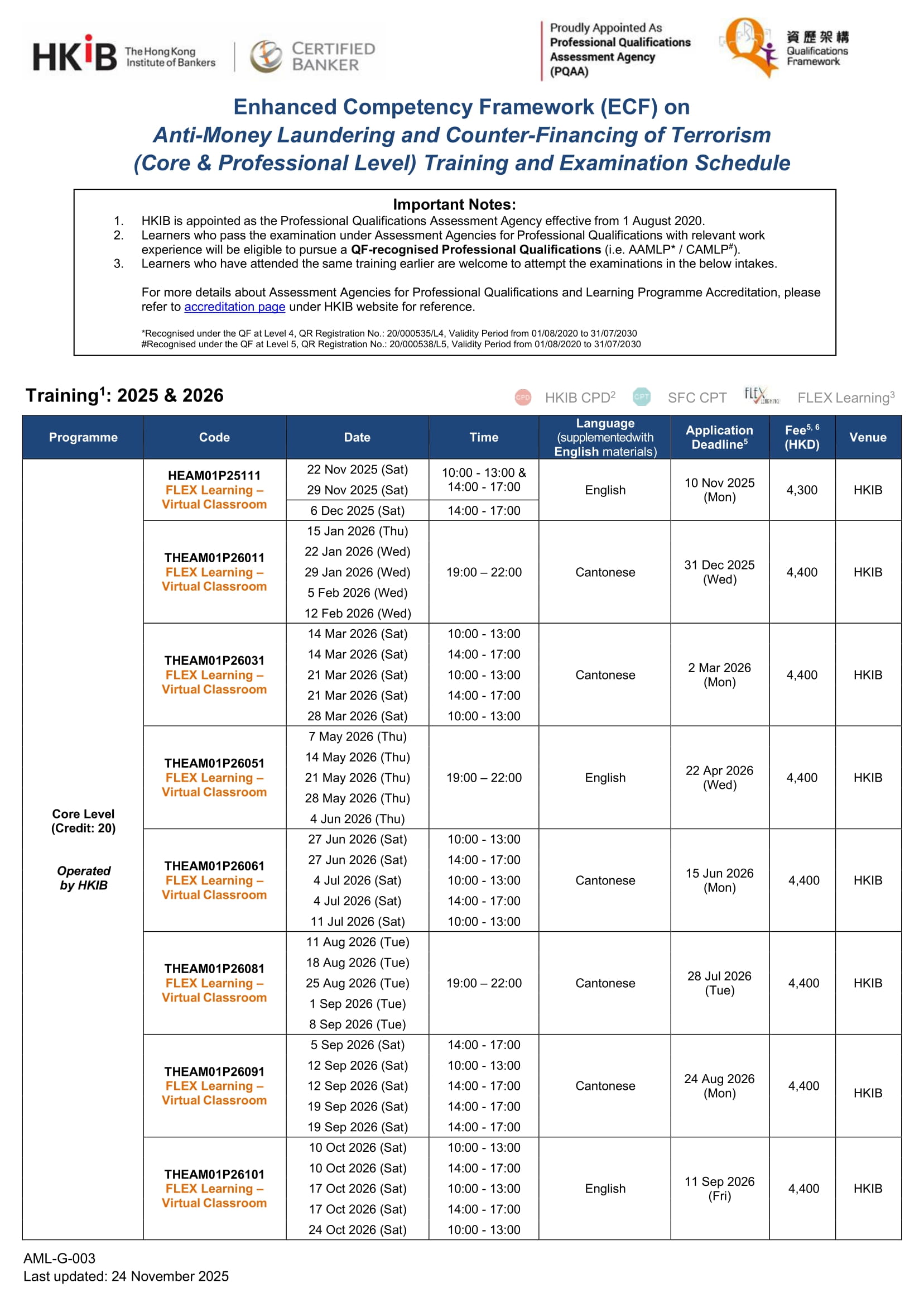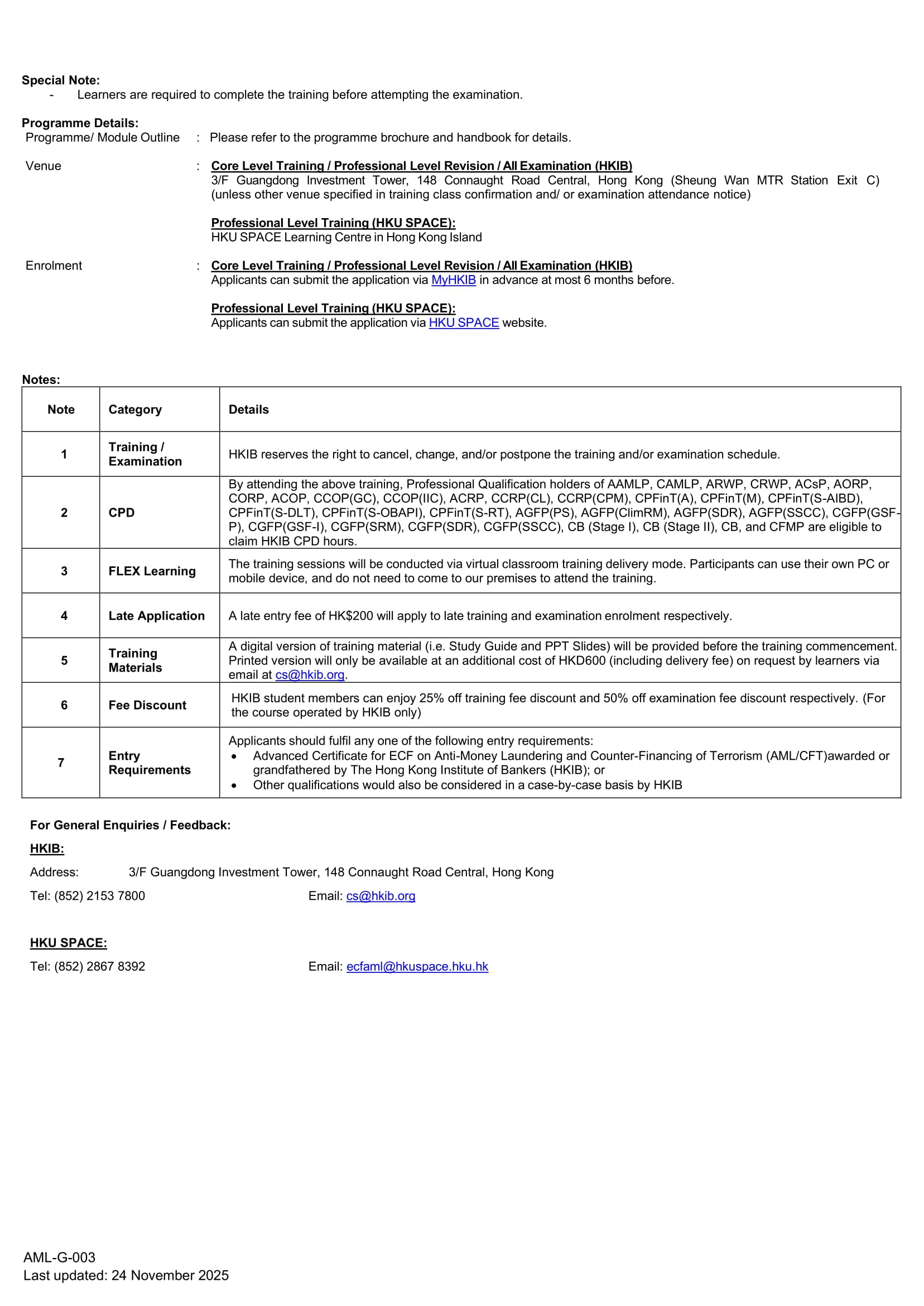 Learners are required to attend both training at HKU SPACE and Revision Session at HKIB. For schedule and enrolment of the ECF-AML/CFT (Professional Level) Training, please visit: HKU SPACE.