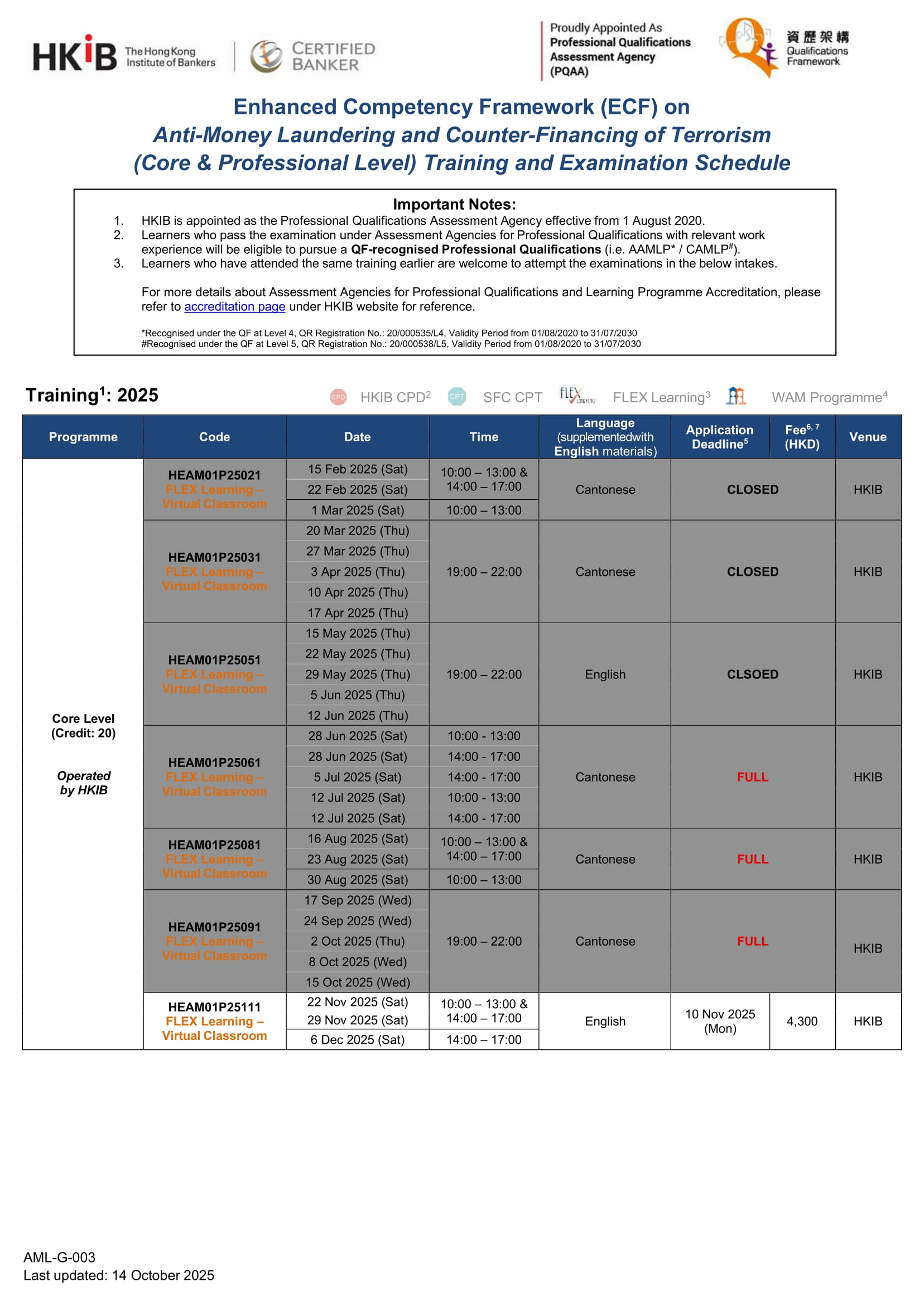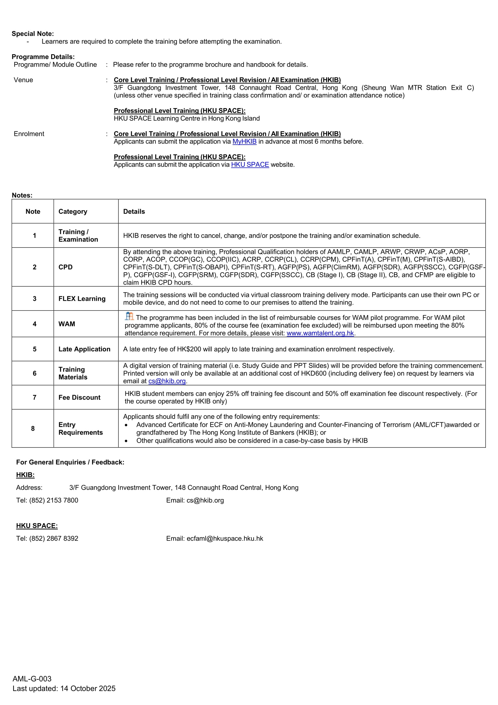 Learners are required to attend both training at HKU SPACE and Revision Session at HKIB. For schedule and enrolment of the ECF-AML/CFT (Professional Level) Training, please visit: HKU SPACE.