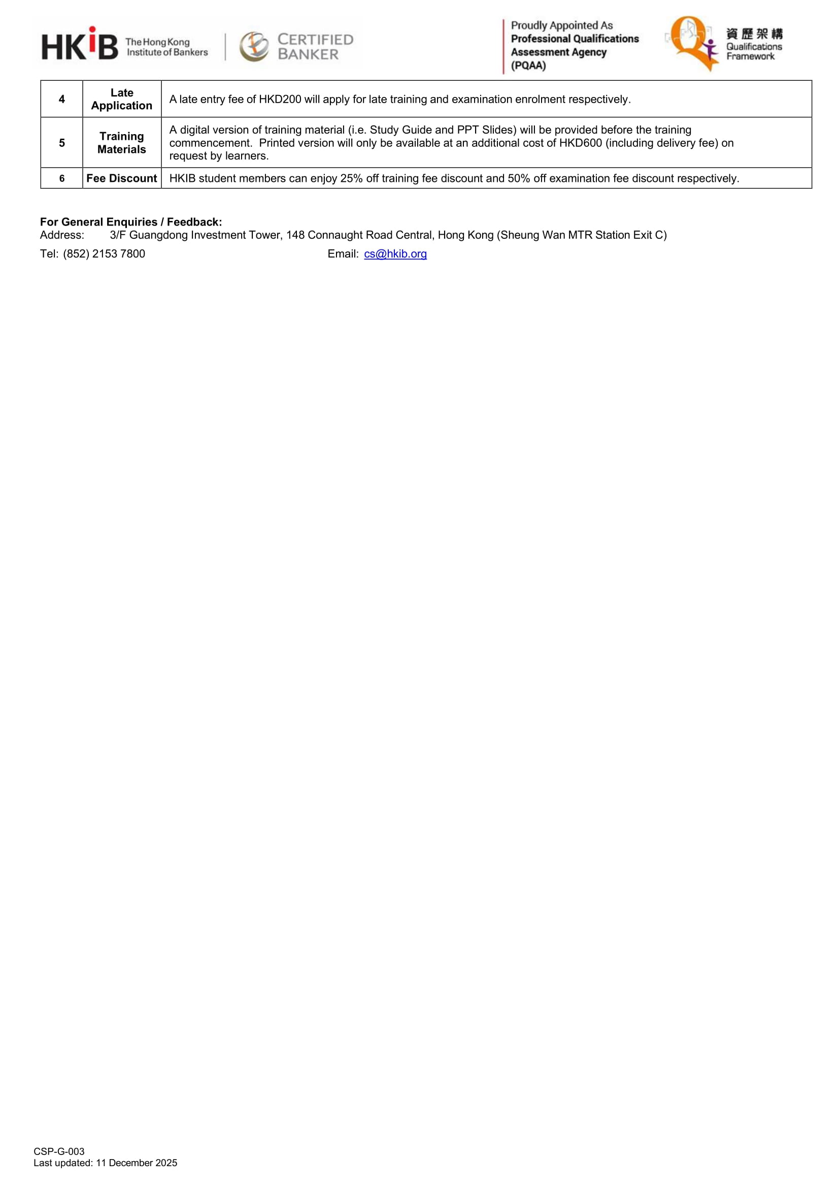^ HKIB student members can enjoy 25% off training fee discount and 50% off examination fee discount respectively.