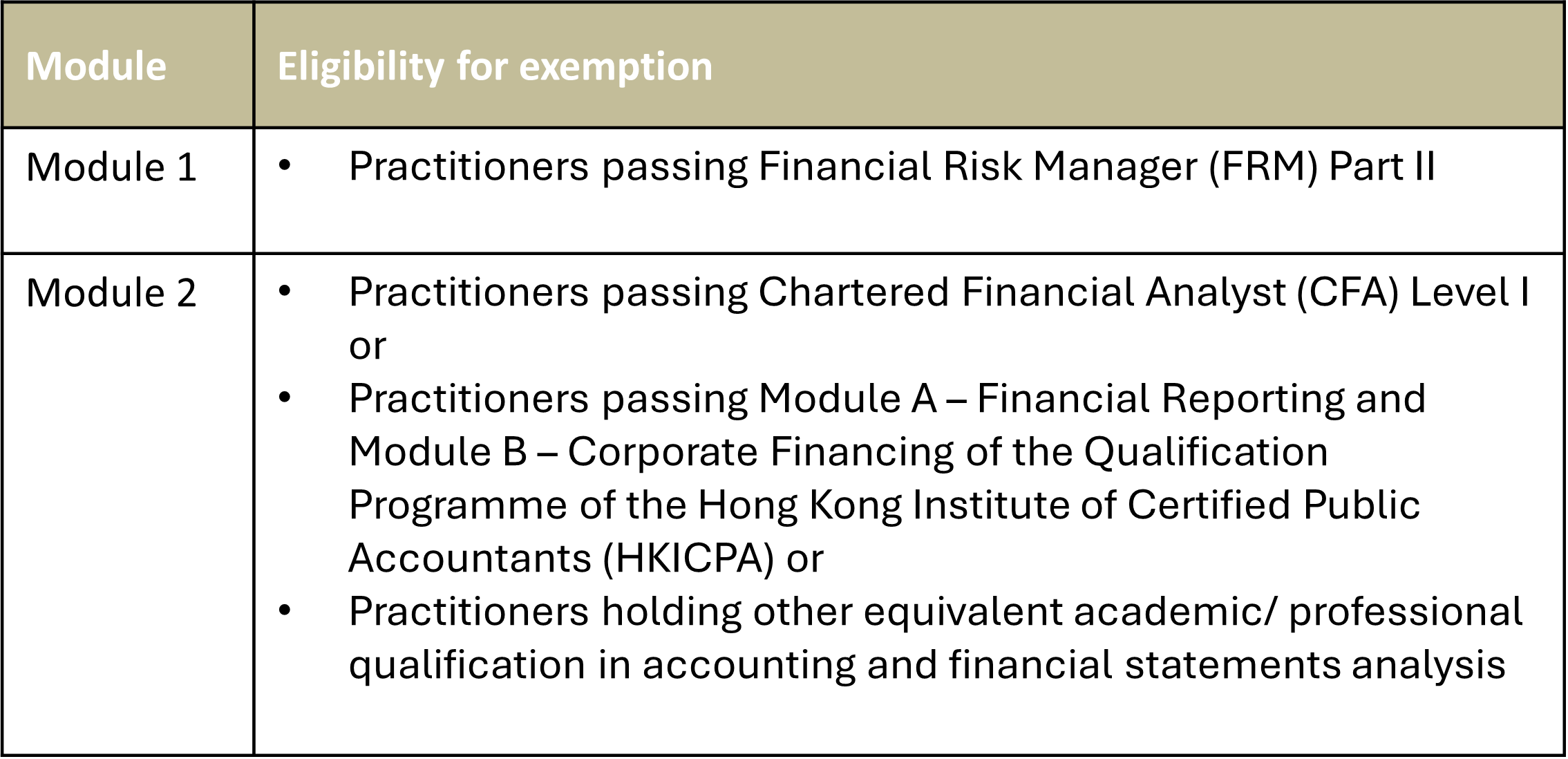 Candidates holding the following qualifications may apply for Modules 1 or 2 exemption of "ECF on Credit Risk Management (CRM) (Core Level)".