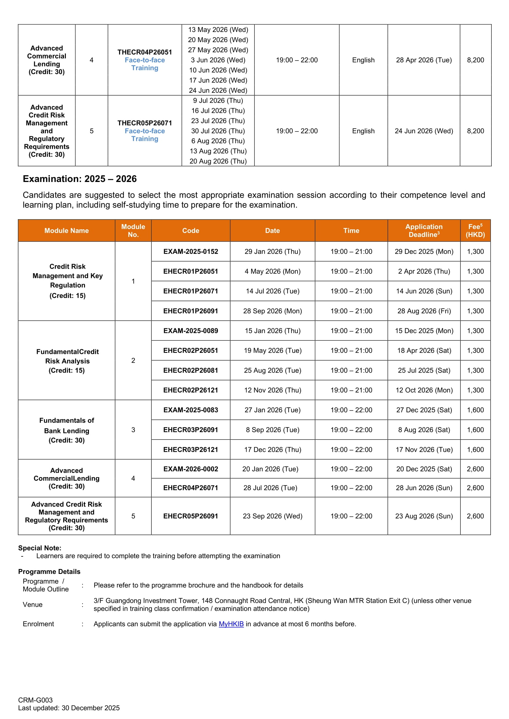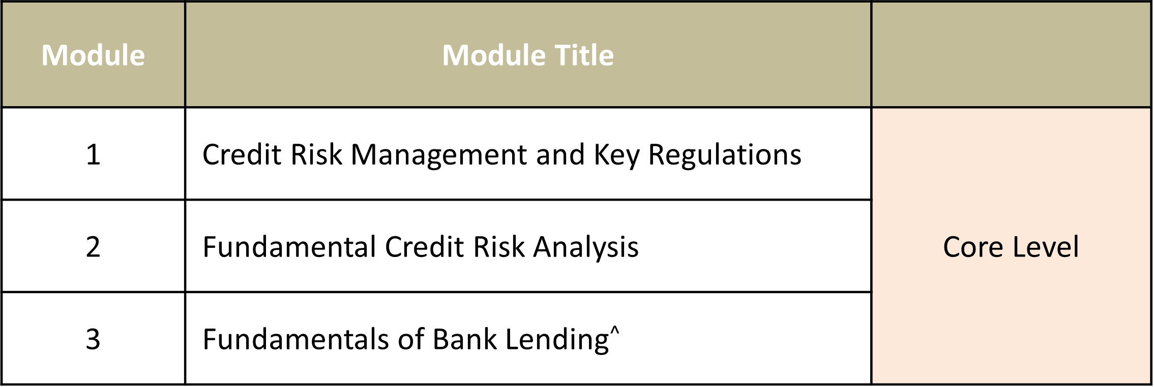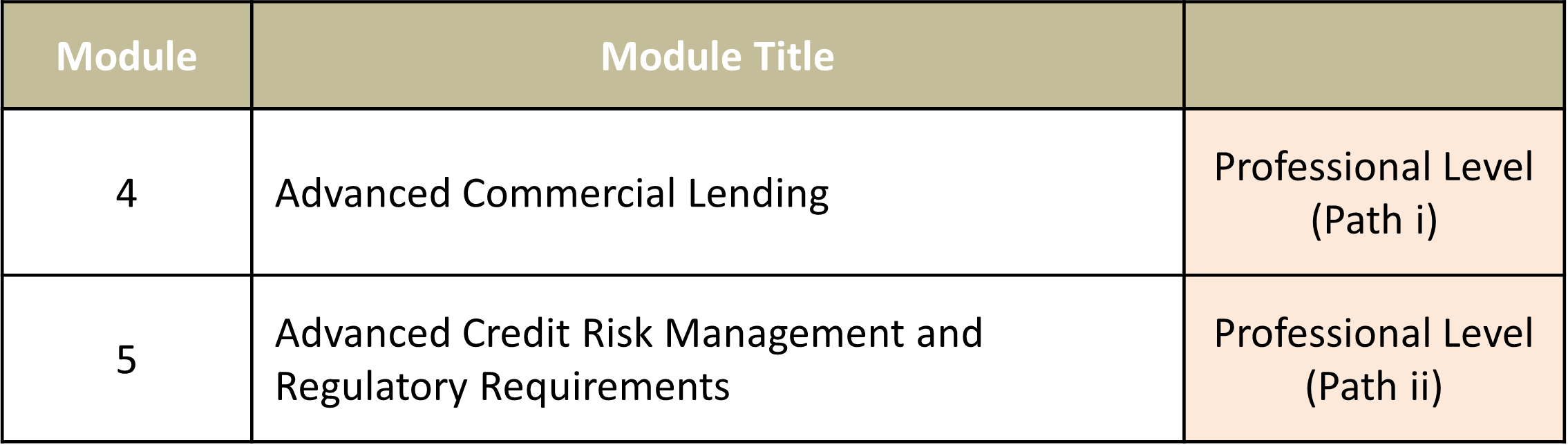 ^ Fundamentals of Bank Lending (Module 3) must be the last module that the learners attempt conditioned with the competition of Module 1 and Module 2 (completed Module 1 and Module 2 training and passed relevant examinations OR obtained modular exemption for Module 1 and Module 2).