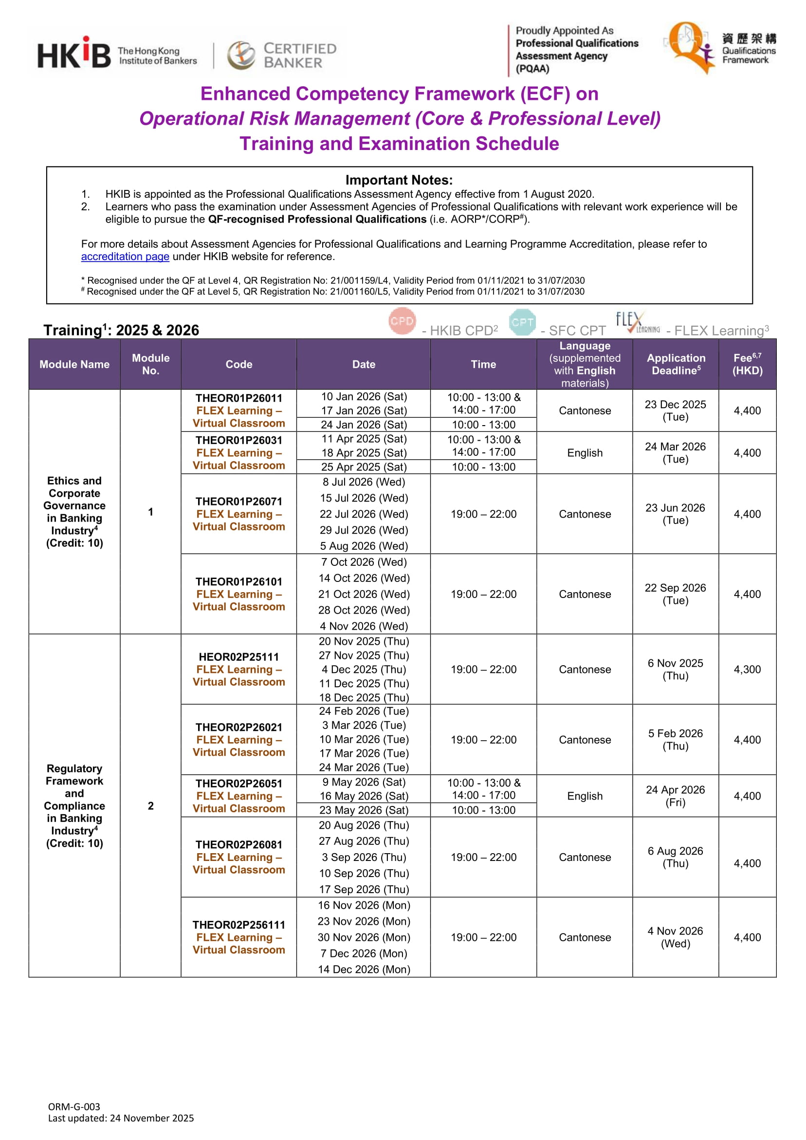 Certified Banker (CB) is a professional banking qualification programme developed and offered by HKIB. This common qualification benchmark is intended to raise the professional competency of banking and financial practitioners in Hong Kong to meet modern demands, while providing a transparent standard with international recognition. “ECF-ORM (Core and Professional Level)” have already been incorporated in CB (Stage I/II) respectively. You may refer to the CB Programme structure to plan for your learning path. Learners who have obtained a pass at the relevant examination can then apply for an exemption for the elective module “ECF-ORM (Core Level)” of the CB (Stage I) programme and the module “ECF-ORM (Professional Level)” of the CB (Stage II) programme.