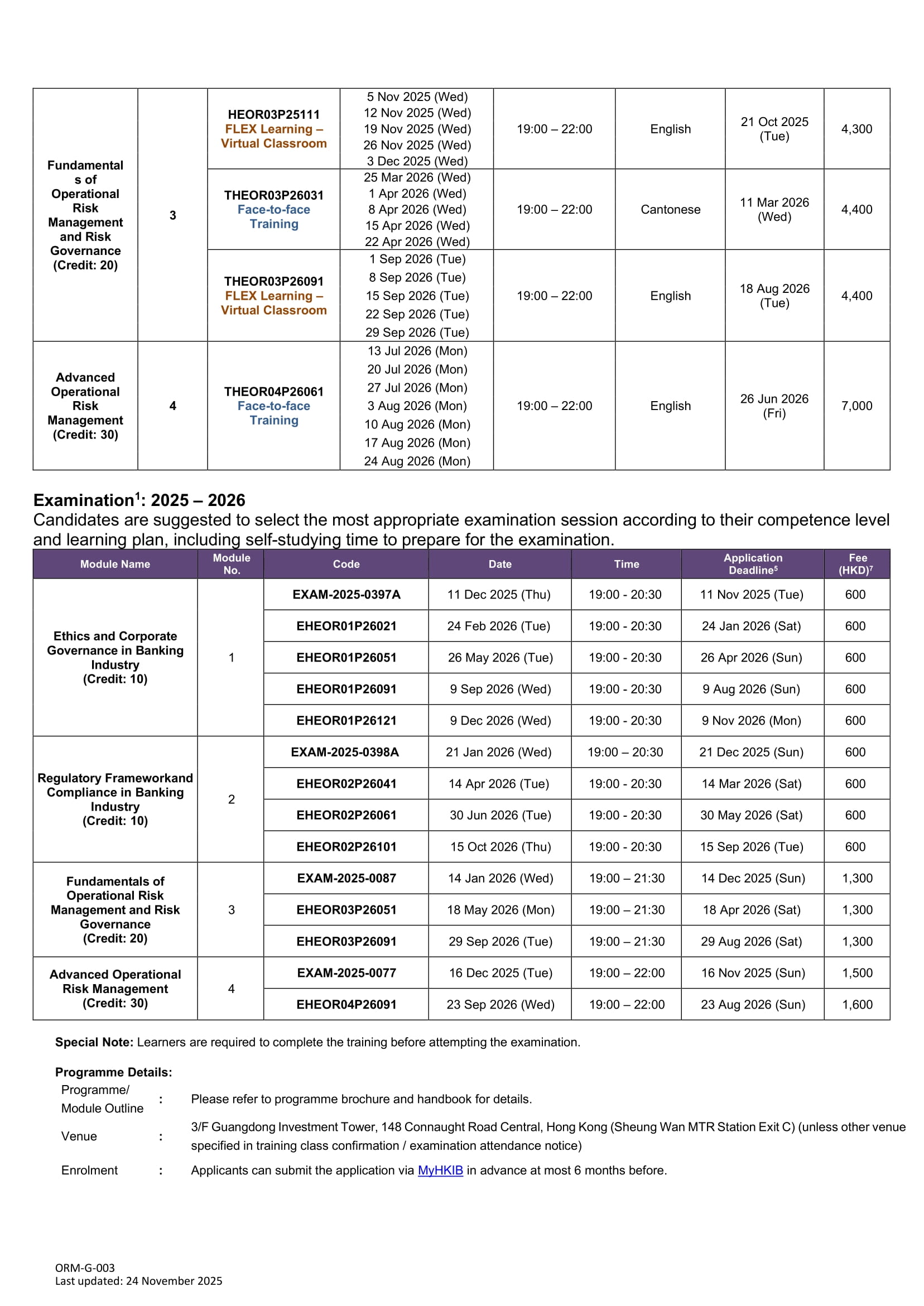The one-off grandfathering arrangement ended on 30 September 2022. For individuals who have sufficient relevant work experience but are not working in an AI during the grandfathering period from 1 July 2021 to 30 June 2022, they may submit their applications to HKIB for grandfathering within 3 months from the date of joining the operational risk management function of an AI and becoming RPs. However, applicant should have met all the applicable grandfathering criteria as prescribed above on or before 30 June 2022. A one-off grandfathering fee will apply.